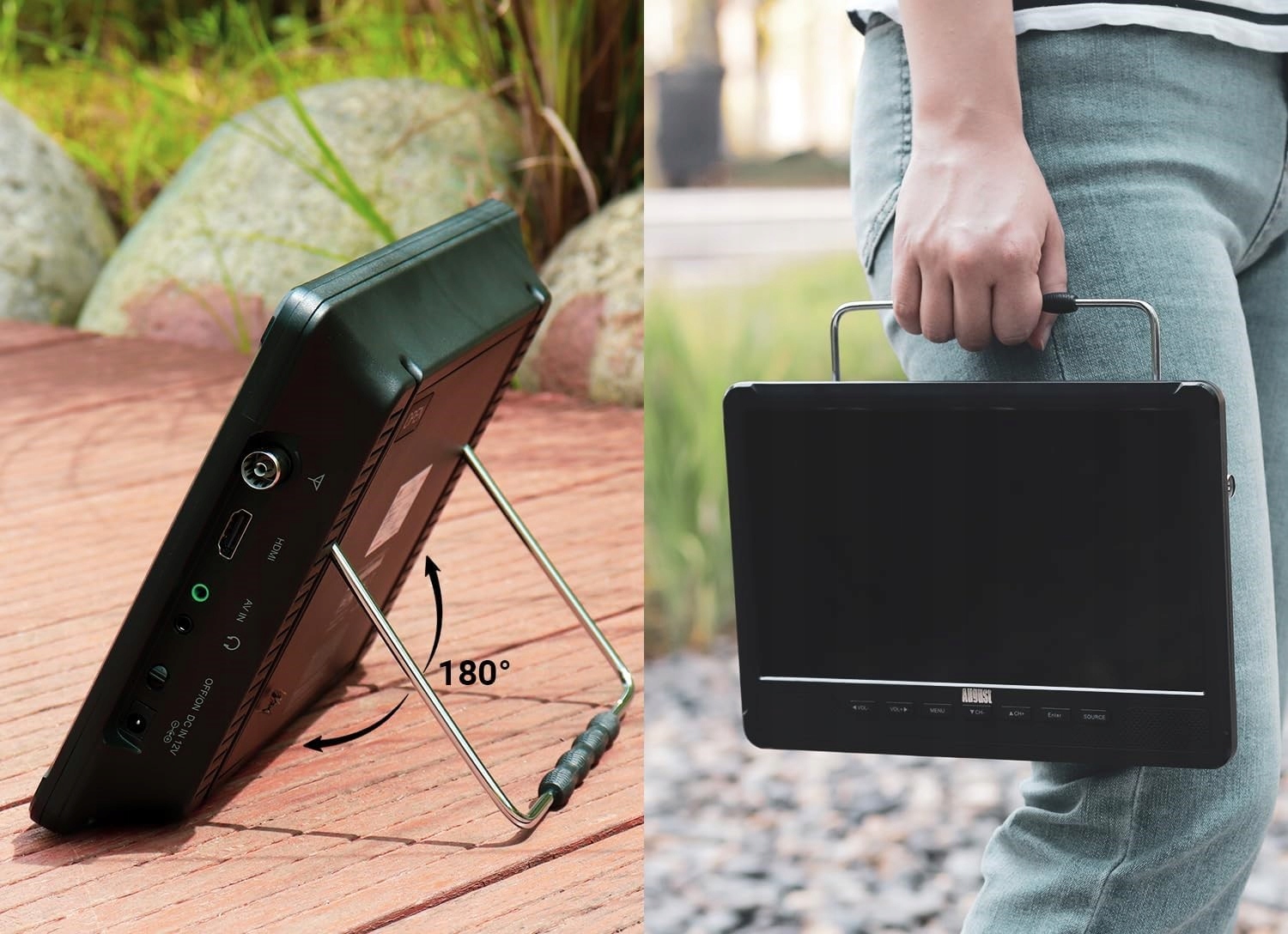 August DA383D-EC to wszechstronny, przenośny telewizor LCD z ekranem 10 cali, który łączy funkcje telewizora DVB-T2 HD, odtwarzacza DVD oraz odtwarzacza multimediów. Idealny do użytku w domu, kuchni, sypialni, garażu, a także w podróży – w samochodzie, kamperze czy na kempingu.