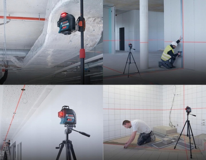 Urządzenie umożliwia równoległe wyrównywanie na podłogach, ścianach i sufitach dzięki jednej linii poziomej oraz dwóm liniom pionowym, co znacząco przyspiesza prace montażowe i wykończeniowe.