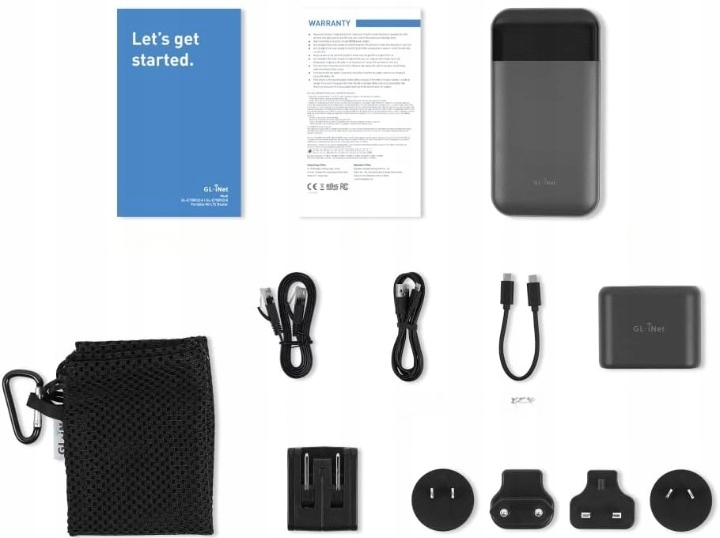 Zawartość zestawu: Router GL‑E750V2 (Mudi) z 2-letnią gwarancją, kabel USB-C → USB-A, kabel USB-C → USB-C, replikator portów USB-C, zasilacz, preinstalowany moduł EM060K Cat6 4G, kabel Ethernet oraz instrukcja obsługi.