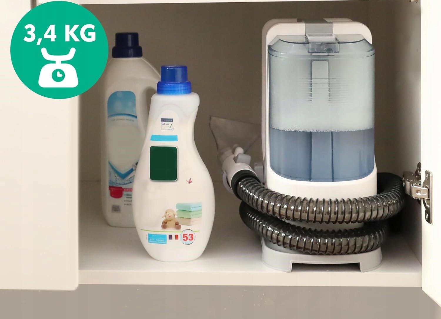 Zintegrowany wąż ssący o długości 120 cm umożliwia wygodne usuwanie plam, a specjalne miejsce do jego przechowywania pozwala na schludne owinięcie go wokół uchwytu.