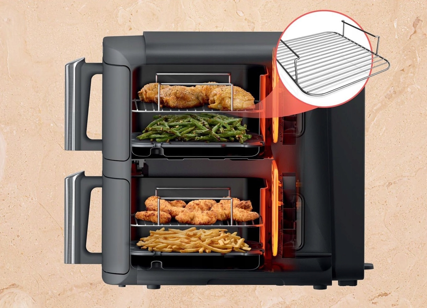 - 2 niezależne szuflady po 4,75 l + 2 stojaki z siatką nieprzywierającą = aż 4 poziomy gotowania.