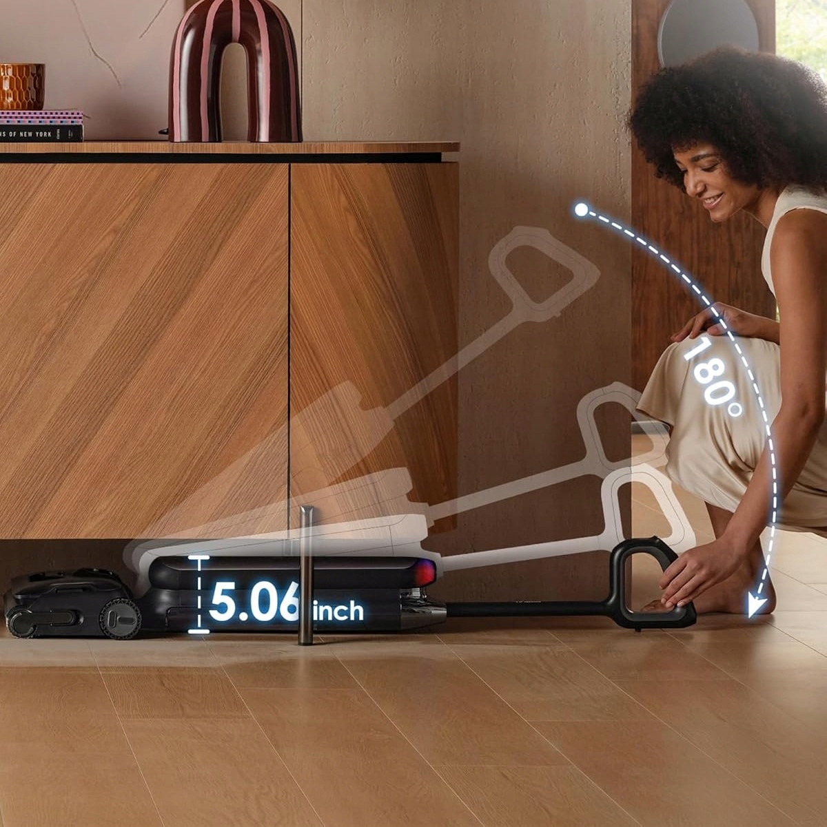 - Ultra płaska konstrukcja 180° – odkurzacz składa się do wysokości ok. 12,8 cm, dzięki czemu bez wysiłku wsuwa się pod łóżka, sofy i meble.