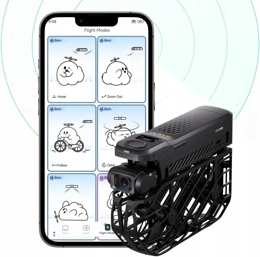 Dron posiada 64 GB pamięci wbudowanej i obsługuje karty microSD do 1 TB. Dzięki aplikacji HOVERAir możesz konfigurować tryby lotu, uruchamiać ręczne sterowanie, pobierać nagrania i edytować je bezpośrednio w telefonie.